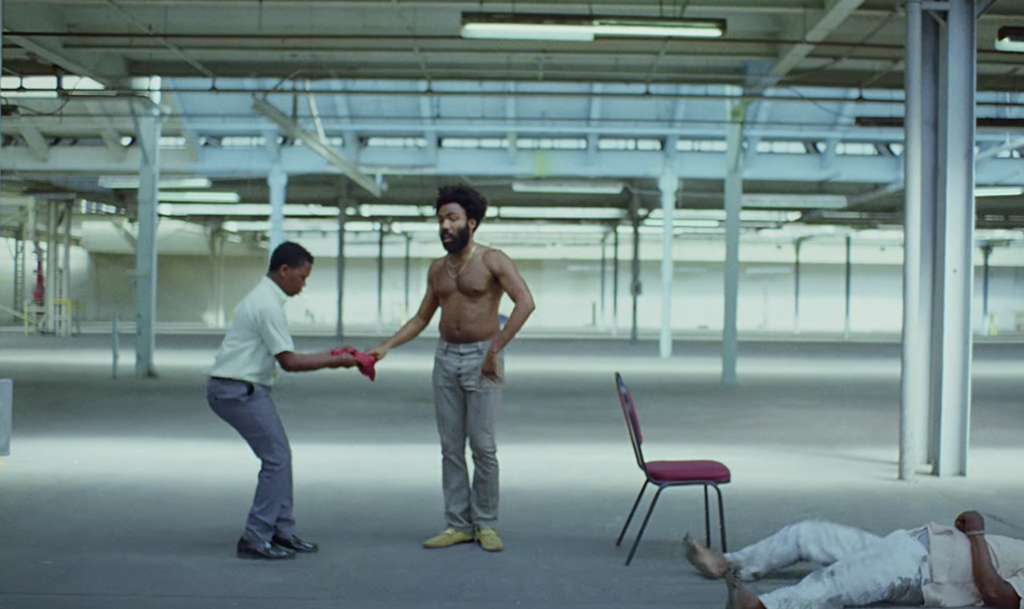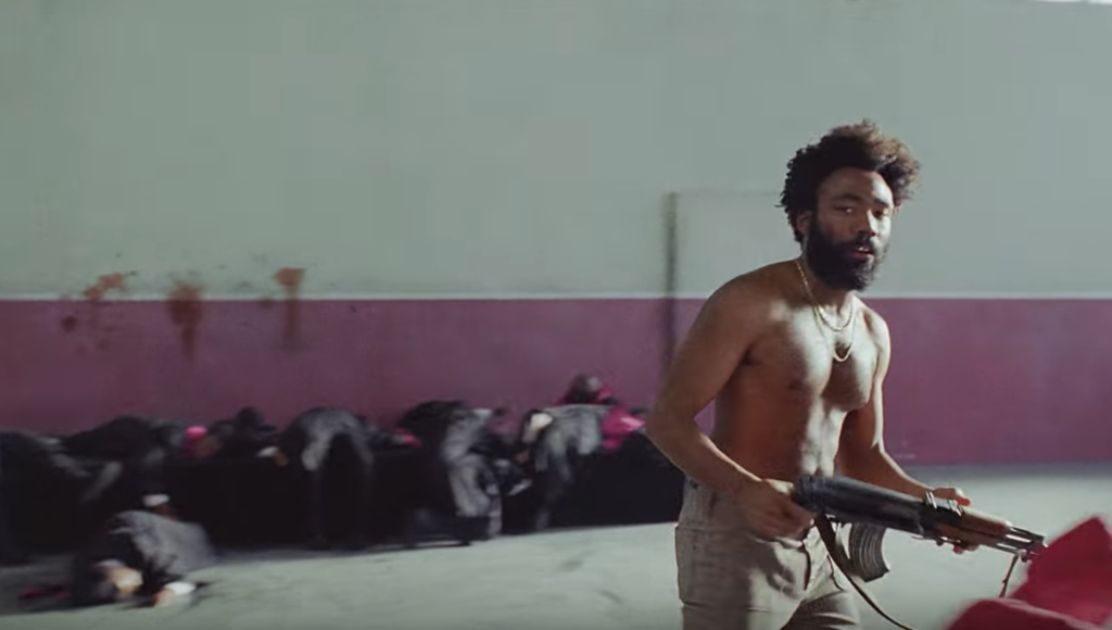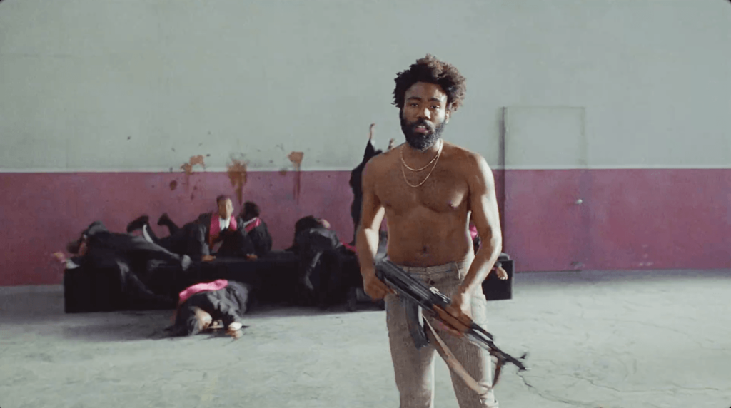 Tras un movimiento, la cámara revela al personaje de Childish Gambino, que comienza a bailar con movimientos un tanto peculiares y haciendo muecas con su rostro para aproximarse al guitarrista y ejecutarle de un tiro en la nuca mientras exhibe un lenguaje corporal grotesco, pero que tiene su explicación.