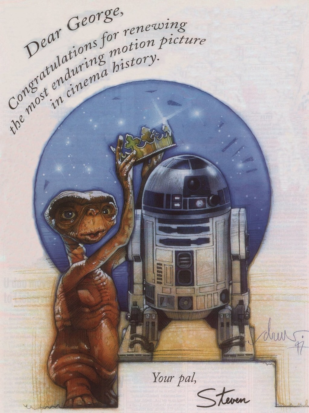 "Querido Steve. Felicidades para ti y para tu colega extraterrestre. Esta semana 'E.T.' adelantó a 'Star Wars' para hacerse con la primera posición en la taquilla nacional. La aventura de E.T. en la tierra y su regalo en forma de amistad intergaláctica continúa tocándonos a todos. Que la fuerza siempre te acompañe".